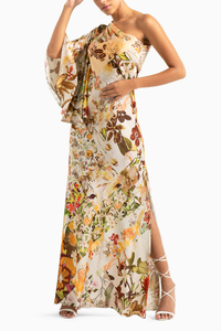The Ochre Floral Rush printed satin one-shoulder kaftan is a striking and elegant garment that effortlessly combines modern style with a touch of luxury. The rich ochre color exudes warmth and regal charm, making it an ideal choice for special occasions. The one-shoulder design adds an air of sophistication and allure, while the floral rush print introduces a dynamic and contemporary twist to the ensemble. This kaftan is a perfect choice for those looking to make a fashionable and memorable statement, marrying classic elegance with a modern edge in one stunning piece, perfect for a variety of special events.