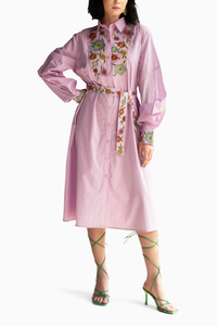 Discover timeless elegance with our midi dress, adorned with exquisite floral thread embroidery that gracefully cascades from the yoke to the belt and cuffs. The A-line silhouette offers a flattering fit, while the front button placket and seam detailing on the sleeves add a touch of sophistication. This dress combines delicate craftsmanship with classic design, making it a perfect choice for a refined and graceful look.