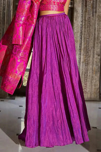 Hand-crushed dual-tone silk maxi skirt in shades of orchid with a crinkled finish. Flowy flare for dramatic movement. Elasticated waistband with side zip and hook/eye closure. Fully lined.