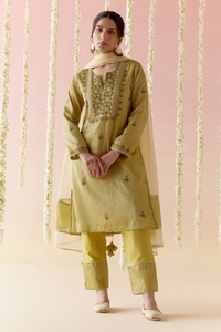 Fabric- Kurta: Crushed Tissue, Pant: Chanderi Tissue, Dupatta: Satka Net Color- Orchid Green Components- 3 Product Code- SVENEROGMKSD03