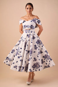 This off-shoulder cotton top features a delicate orchid print with intricate 3D embroidered flowers, adding texture and romantic charm. The flattering neckline beautifully frames the shoulders for a feminine touch. Paired with a soft cotton midi skirt showcasing the same striking orchid print, the look exudes fresh elegance. The high-waisted, flared silhouette enhances the figure and adds graceful movement, perfect for both day and evening wear.