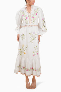 A dreamy fusion of artistry and elegance, this long straight-fit dress is adorned with multicolored floral cutwork embroidery, creating an exquisite interplay of texture and vibrancy. Crafted from lightweight, breathable cotton, it offers both comfort and sophistication.