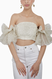 Pale gold organza top complete with ruffle sleeves and chain embroidery.