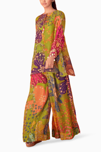 Step into sophistication with the Green Printed Organza Cuff Embellished Top paired flawlessly with Pants and a coordinating Bustier, a striking ensemble that blends contemporary flair with timeless charm. Crafted from luxurious organza, the top features intricate cuff embellishments that add a touch of elegance and sophistication to its vibrant green hue.The tailored Pants complement the top with their sleek silhouette, ensuring a flattering fit and effortless style. They provide comfort and ease of movement, making them perfect for both formal and semi-formal occasions.
