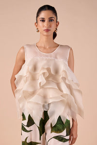 This elegant top is crafted in sheer organza and features layered ruffles that cascade down the bodice in soft, sculptural waves. A delicate braid detail along the neckline adds a refined, textural accent, elevating the overall design. The tiered placement of the ruffles creates volume and movement, resulting in a statement silhouette that is both dramatic and ethereal—perfect for a striking, high-fashion look.