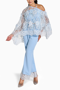 Featuring one-shoulder cape with 3D flowers, pearls and bead work. Paired with bralette top and straight pants with organza scalped detailing at hem.