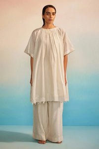 Crafted from breathable, hand screenprinted Chanderi, the Orihome Kurta is designed to offer both comfort and elegance. Its lightweight fabric drapes perfectly on the body, making it ideal for everyday wear. The kurta features crisp box pleats at the front and back, adding subtle volume and movement. Delicate appliquembroidery adorns the sleeves and hem.A seamless blend of structure and artistry, the Orihime Box Pleat Kurta is a timeless piece that elevates your everyday wardrobe with effortless grace.
