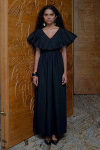 The Oro Dress is a bold yet graceful silhouette crafted in crisp cotton poplin. Featuring a V-neckline framed by dramatic layered ruffles, this dress is equal parts playful and poised. The softly gathered waist gives way to a flowing skirt, making it an effortless choice for daytime charm or moonlit dinners. Lightweight, statement-making, and endlessly flattering.