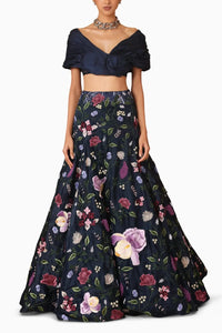 Presenting Shriya Som's bridal skirt from the Chrysalis Collection, beautifully crafted in a delicate organza base and adorned with signature embroideries, 3D florals, and sequinned blossoms, creating a striking and elegant bridal look. Paired with a taffeta drape top, this ensemble exudes sophistication and modern bridal charm.