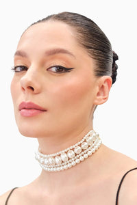 The Oval and Round White Pearl Choker features a beautiful blend of oval and round pearls, carefully arranged to create a unique and elegant design. The lustrous white pearls add a touch of sophistication, while the mix of shapes adds visual interest and texture. This choker sits gracefully around the neck, making it a timeless accessory.