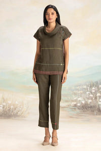 A linen round roll-collared top with unique overlocked seam lines in contrasting colors, adding a perfect design detail to the garment. Paired effortlessly with our signature cigarette pants, this relaxed-fit piece offers both style and comfort for a modern, effortless look.