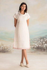 A linen round roll-collared dress with extended sleeves, featuring unique overlocked seam lines in contrasting colors that add a perfect design detail to the garment. This piece combines effortless style with modern sophistication for a chic, elevated look.