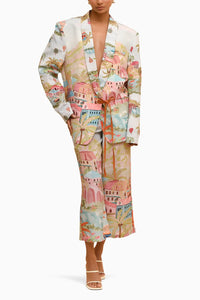 Elevate your wardrobe with this Cityscape Printed Blazer, featuring full-length sleeves, a structured fit, and delicate lace details. The cross tie-up design adds a modern twist, while the looser fit offers comfort and style. Paired with matching Cityscape Printed Trousers, these ankle-length pants with an elastic waistband and slip-on design complete a chic, urban look that’s perfect for any occasion.