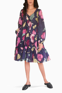 Add some fun to your wardrobe with our knee-length Oxford Flower tiered dress with foliage print crafted in chanderi silk in Persian blue color. This dress features bishop sleeves and V-neckline adorned with bead hand work detailing. The relaxed anti-fit of this dress, makes it a daywear essential.