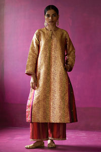 The Pachranga Mahboob Brocade Kurta is crafted from handwoven Kimkhwab brocade, featuring a revived 19th-century floral and paisley jaal in gold-plated zari. Made with signature five-hued pachranga silk, it includes zari booti side panels and a zardozi-embroidered sleeve border for a regal, heritage-rich finish.
