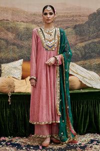 Pink tissue suit with mirror work yoke and crushed tissue lined with chanderi pants and a organza green dupatta delicate mirror work is done on border of pants, kurta, slip and dupatta.