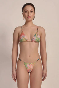 The Paige Mahé Triangle Bikini Set brings a luxe twist to a timeless classic. The top features double straps adorned with semi-precious gemstones, gold-plated tassels, and adjustable ties for a flawless fit. Paired with the cheeky Lana bottom, complete with a ruched back and matching gemstone details, this set is made to sparkle under the sun.
