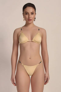 Light up the shoreline in the Paige Yellow Iris Triangle Bikini Set. The top features double gemstone-studded straps, gold-plated tassels, and adjustable ties for a perfect fit. Paired with the cheeky Lana bottom, complete with a ruched back and matching sparkling straps, this vibrant set is your go-to for sun-soaked glamour.