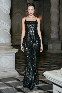 Statement flared pant with platinum-grey sequins in variegated sizes. The sequins sit in layered variation, giving the surface a soft, iridescent shimmer. Allover embroidered paillette sequins on a black base. Concealed zipper and hook/eye closure in the center back. Garment is fully lined.