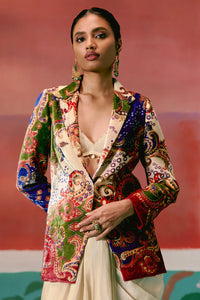 The blazer is designed on an ecru base with an all-over paisley print, offering a bold yet elegant take on festive dressing.