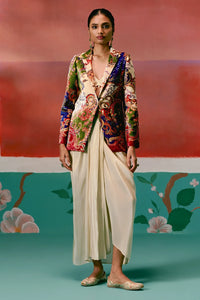 Dramatic and refined, the Paisley Blazer Dhoti Set is a statement ensemble crafted in plush velvet. The blazer is designed on an ecru base with an all-over paisley print. Paired with a solid ecru bustier featuring an elasticated back, adjustable straps, metal hangings at the waist, and delicate beaded hand embroidery along the neckline, it balances structure with artisanal detail. The dhoti skirt, styled in a fluid draped silhouette with an elasticated back, completes the look—offering a bold yet elegant take on festive dressing.