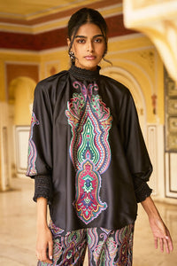 Placement printed top with an ornate paisley print, smocked high neckline and cuffs. Features raglan bishop sleeves, a curved hem, and back button closure.