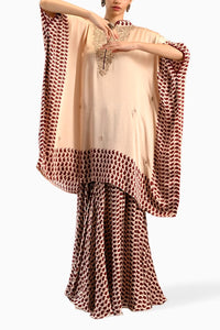 Embrace elegance with the Paisley Pansy Sharara Set. Fashioned from Bemberg Modal satin in a calming ecru, it boasts delicate hand embroidery. The tunic's lace accents and round neck design harmonize with the sharara's silver gotta edges and elastic comfort.