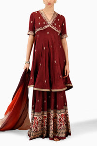Exude timeless elegance with the Paisley Raat Rani Sharara Set. Spun from Bemberg Modal satin and complemented by a silk dupatta in a deep maroon hue, it shines with intricate hand embroidery. The set is comprised of a V-neck tunic with a side zip, a delicately lined sharara, and a shaded dupatta adorned with sequins and silver gotta.
