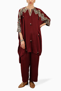 Step into the limelight with the Paisley Taal Kaftan Set. This maroon ensemble, made from Bemberg Modal Satin, showcases the finesse of hand embroidery. The poncho is distinguished by embroidered cuffs, while the pants, complete with pockets, ensure comfort with their all-over elastic.