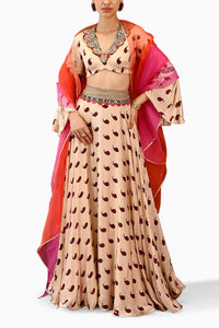 Enhance your celebratory ensemble with the Paisley Veena Lehenga Set. This ecru and rust piece, crafted from Bemberg Modal Satin and accentuated with hand embroidery, promises elegance. The V-neck blouse features a flared sleeve and side zip, complemented by a shantoon-lined skirt with a silver gotta hem. The sequenced, shaded silk organza dupatta with a silver gotta edge adds a final touch of sophistication.