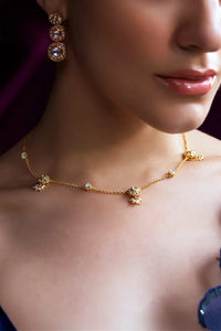 The Essence-The iconic Kundan necklace is inspired by the art and architecture of the Mughal era. Choicest Iceberg and Pastel Plum stones have been set together to create this exquisite piece of jewelry.