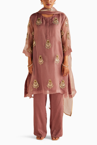 Featuring an A-line embroidered kurta with pants, it comes along with dusky pink embroidered dupatta.