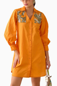 The Palm Sunset orange cotton short dress features beautiful leaf embroidery and a straight shirt silhouette. With machine-embroidered leaf windows on the shoulders, fabric buttons, 3/4th balloon sleeves with tie-up cuffs, and stitch line details on the sleeves and collar, this dress is both stylish and functional. Complete with side pockets and a relaxed fit, it offers comfort and charm.