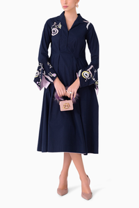 Introducing the Paloma Navy Cotton Satin Embroidered Dress—a stunning midi that combines elegance and comfort. This cotton dress features beautiful shoulder and sleeve embroidery, complemented by flounce sleeves for a feminine touch. With stylish hooks in the front and a flattering fit-and-flare silhouette, this dress is perfect for any occasion. Elevate your style with this chic and eye-catching piece!