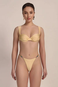 Channel effortless glamour with the Pamella Yellow Iris Balconette Bikini Set. The top features ruched cups, wide supportive straps, underwire detailing, and our signature branded lock closure for a touch of luxe. Paired with the Emma Brazilian thong bottom, adorned with semi-precious gemstones and a flirty high-leg cut, this handcrafted set is made to flatter, elongate, and turn heads from beach to poolside.