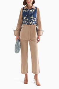 This stylish Pandora set includes a cotton satin button-down collared shirt with full sleeves and cuffs, paired with calf-length flared pants featuring side pockets. The denim hand-embroidered jacket adds a trendy touch, with a half-length design, tie-knots, and contrast piping and stitch line detailing for a chic, coordinated look.