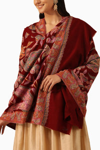 Introducing the Pankti handmade pashmina shawl, a remarkable creation. With its deep red color and exquisite Abi Kari design handwork, this shawl exemplifies the meticulous attention to detail put into its making.