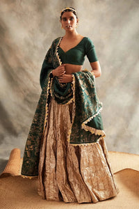 Featuring a gold woven zari gherdar crinkled lehenga paired with a striking lampi blouse, beautifully complemented by embossed print, hand embroidery with triangle detailing, a perfect fusion of texture, tradition, and craftsmanship.