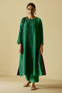 The Panna Falaknuma Kurta is tailored in the finest silk and is delicately embroidered with paisley bootas in dabka and pitta embroidery. The kurta comes with a matching silk pyjama.