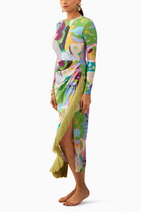 Featuring the Paolozzio Vanessa Skirt by Tizzi. A playful and fancy companion to our Pleat Neat Skirt, the Vanessa skirt is a delightful piece. This pleated skirt boasts a diagonally detailed cut finished with fringes, cinched at the high waist, and features a stylish front slit for added flair.