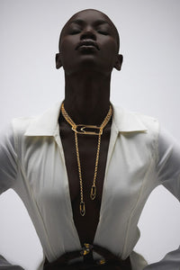 Add elegance to your collection with the Paper Clip Lasso Neckpiece. This sophisticated necklace features a detachable pendant, crafted from hypoallergenic brass and plated in rich 22k gold. Its versatile design allows for multiple styling options, making it a chic addition to any outfit.