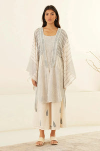Featuring Papyrus White Kimono Cape Set by Cotton and Clay, a breezy hand block printed ensemble in luxurious silk voile. The kimono cape pairs beautifully with a sleeveless inner top and flared hem trousers, highlighted by delicate French knot details in a serene papyrus white and dusty blue palette.