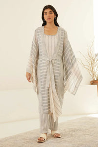 Featuring Papyrus White Kimono Set by Cotton and Clay, a refined hand block printed ensemble in airy silk voile. This long kimono, paired with a sleeveless inner top and trousers, is accentuated with delicate French knot detailing—radiating effortless elegance in a tranquil papyrus white and dusty blue hue.