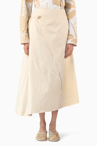 Indulge in classic style with our Parchment Skirt. This expertly crafted piece features a gold accent button, mimicking a scarf for a unique touch. The sophisticated length and neutral color make it versatile, perfect for pairing with any outfit. Elevate your style and make a statement with this exclusive piece.