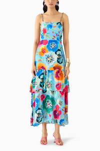 The Parfait Bustier Dress crafted from our stunning Viscose crepe fabrication, trans-seasonal, is a statement piece. The dress, digitally printed in our multi colour parfait rose print, is lined. With delicate beaded straps, this dress has a bustier fit on the top with layering at the bottom. Featuring a summery look, it has ruching on the back for stretch.