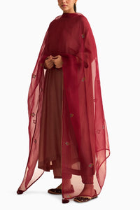 Embroidered organza dupatta in deep red with beautifully hand crafted tassels.