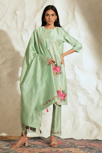 Embrace the charm of understated elegance with our 'Parisa' set. Crafted in luxurious Chanderi fabric, this pastel green kurta features vibrant floral embroidery that adds a fresh and lively touch. The plain straight pants complement the look perfectly, allowing the intricate embroidery on the kurta to shine. The set is elevated with a Chanderi dupatta adorned with intricate borders on two sides, adding a graceful flow to your ensemble. Ideal for festive occasions, 'Parisa' is where comfort meets style in the most beautiful way.