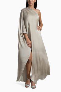 Our Paros is a steal buy and is a fashion essential. Kaftan is made in silk like satin with one shoulder detailing and a long slit given on side.