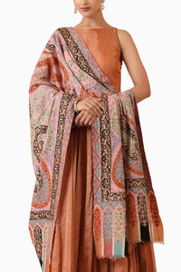 Indulge in vibrant luxury with the Pashi Pashmina Shawl. Handwoven pashmina wool meets exquisite Kalamkari Adda work, creating a stunning shawl draped in silk stories. Soft, warm, and lightweight.