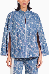 Featuring the Passion Denim Cape from House of Zeniaa's Rodeo Blue Collection. This versatile cape exudes style and grace, with a front open design and zip closure. Pair with color block denim pants for a flattering silhouette.